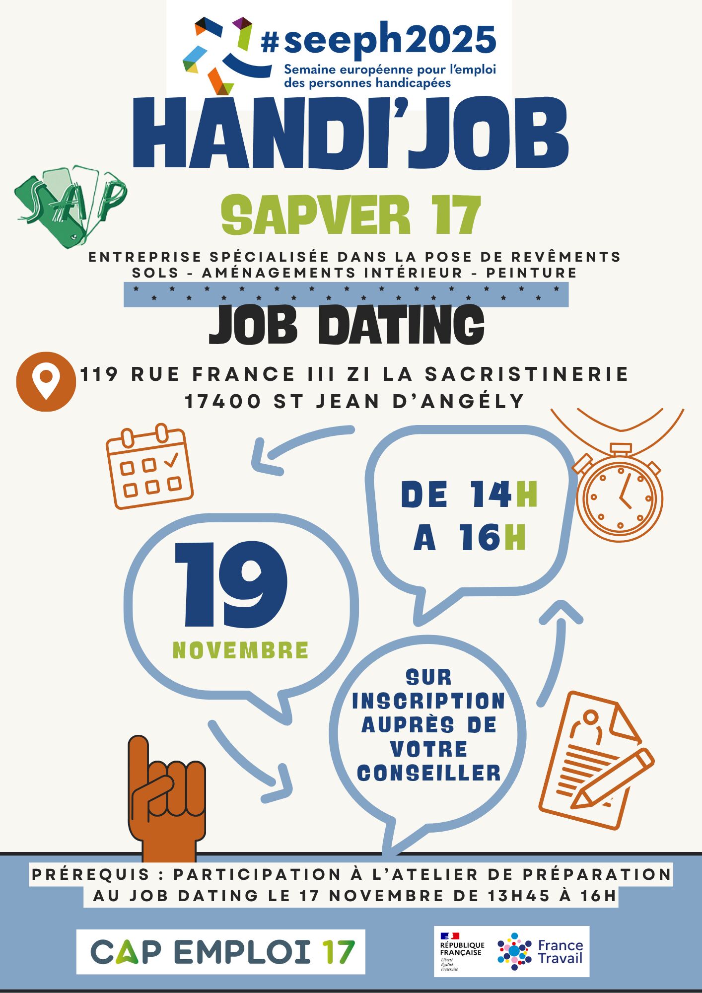 Participation à l'atelier de préparation au job dating le 17 novembre de 13h45 à 16h. Inscription auprès de votre conseiller