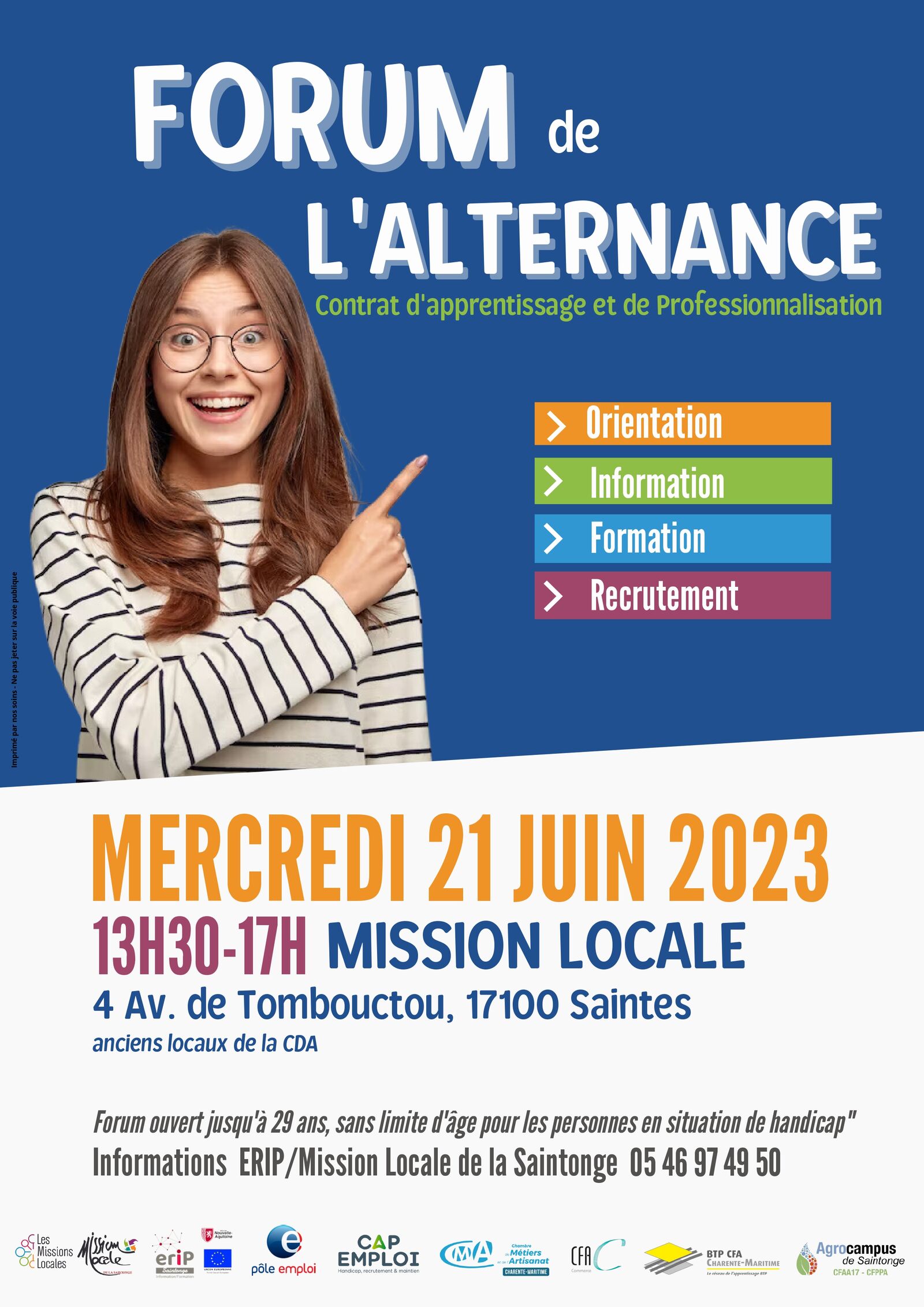 Forum ouvert aux personnes jusqu'à 29 et sans limite d'âge pour les personnes reconnues travailleur handicapé. Pour tout renseignement veuillez contacter le 0546974950