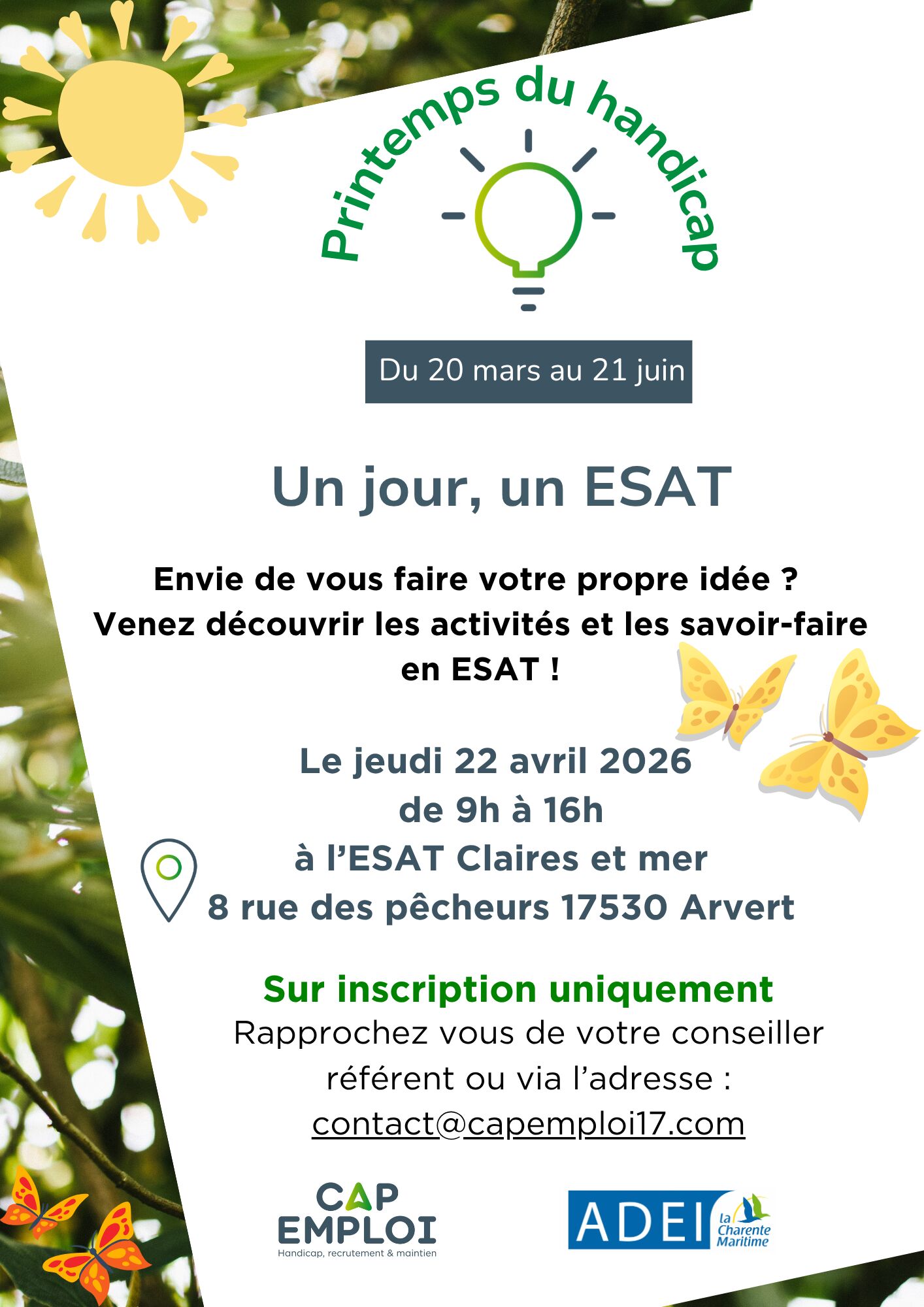 À l’occasion du Printemps du handicap, Cap emploi se mobilise et organise des animations sur l’ensemble du territoire. Dans ce cadre, une journée « 1 jour, 1 ESAT » sera organisée le 22 avril. Elle a pour objectif de faire découvrir le milieu des ESAT à des personnes se questionnant sur son orientation, à travers une immersion au sein d’un atelier.