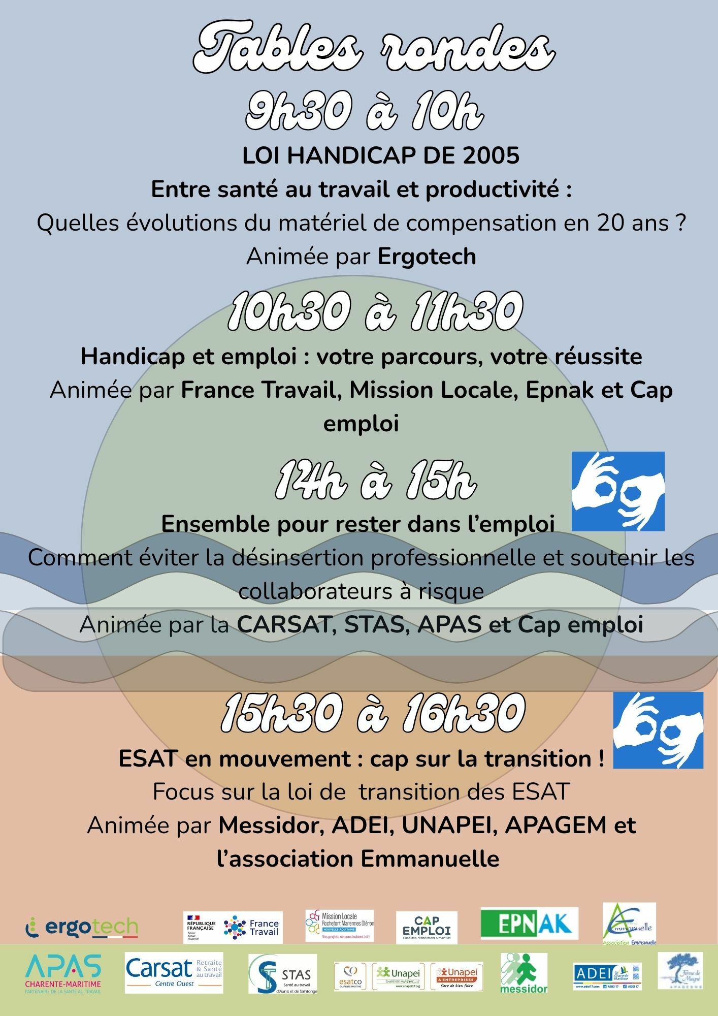 14h à 15h Ensemble pour rester dans l’emploi Comment éviter la désinsertion professionnelle et soutenir les collaborateurs à risque Animée par la CARSAT, STAS, APAS et Cap emploi Avec la présence d'interprète en langue des signes